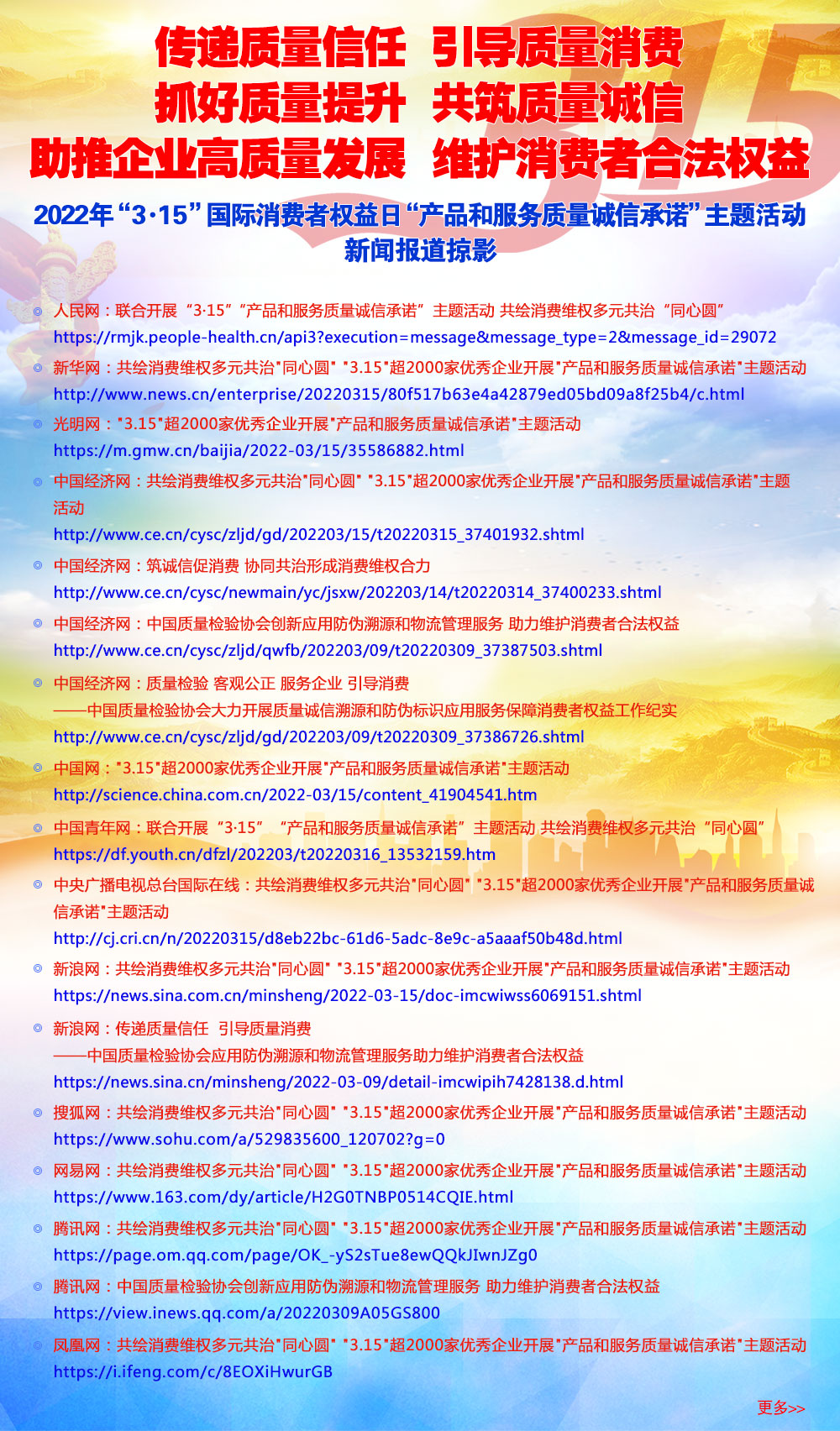 (十四)開展企業(yè)質(zhì)量檢驗(yàn)機(jī)構(gòu)的評審,開展質(zhì)量評估和推廣質(zhì)量保險業(yè)務(wù),利用各種方式向消費(fèi)者提供質(zhì)量信息,宣傳和普及質(zhì)量知識和消費(fèi)常識,傳遞質(zhì)量信任、引導(dǎo)質(zhì)量消費(fèi),為市場、企業(yè)和消費(fèi)者服務(wù),切實(shí)維護(hù)社會各界的合法權(quán)益;