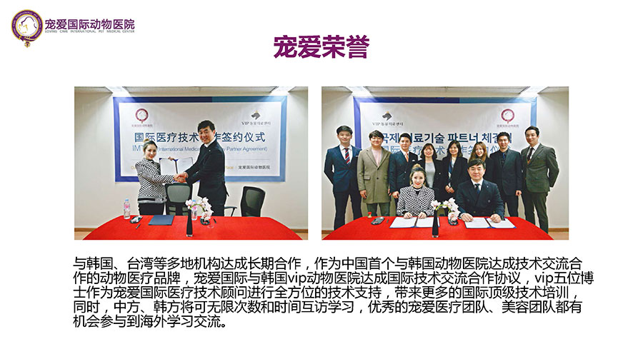 寵愛國際動物醫療中心不僅提供高水準的寵物診療服務,為寵物疑難復雜疾病的治療提供更加專業化的解決方案,還同時承擔寵愛國際技術研發和人才培養、國際技術交流合作的重要使命。憑借寵愛國際連鎖動物醫院在人才隊伍、設施設備、國際化醫療基準上的優勢,寵愛國際已經成為國內更具品牌影響力和發展潛力的寵物醫療服務品牌。