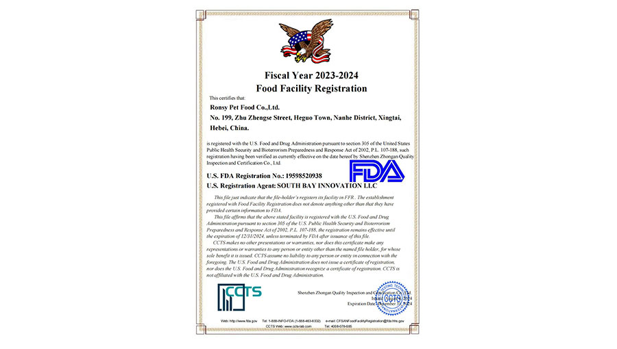 榮喜寵物食品公司專注于自主開發(fā)寵物食品已達(dá)23年,耗資5億元人民幣建設(shè)了智慧4.0數(shù)字化工廠。該公司榮獲了多項(xiàng)國(guó)內(nèi)外嚴(yán)格的質(zhì)量標(biāo)準(zhǔn)及體系認(rèn)證,包括美國(guó)食品藥品管理局認(rèn)證(Food and Drug Administration,簡(jiǎn)稱FDA認(rèn)證)、國(guó)際質(zhì)量管理體系ISO9001、國(guó)際環(huán)境管理體系ISO14001、國(guó)際食品安全管理體系ISO22000以及國(guó)際職業(yè)健康安全管理體系ISO45001等多項(xiàng)國(guó)際嚴(yán)格標(biāo)準(zhǔn)體系認(rèn)證。