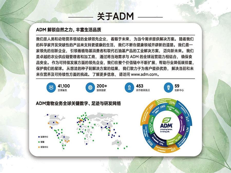 ADM作為人類、動物及寵物營養領域的全球前沿企業,致力于寵物營養領域的創新,該公司的全球專家團隊深入研究寵物全生命周期的營養需求,為中國寵物帶來前沿、優質的營養解決方案。