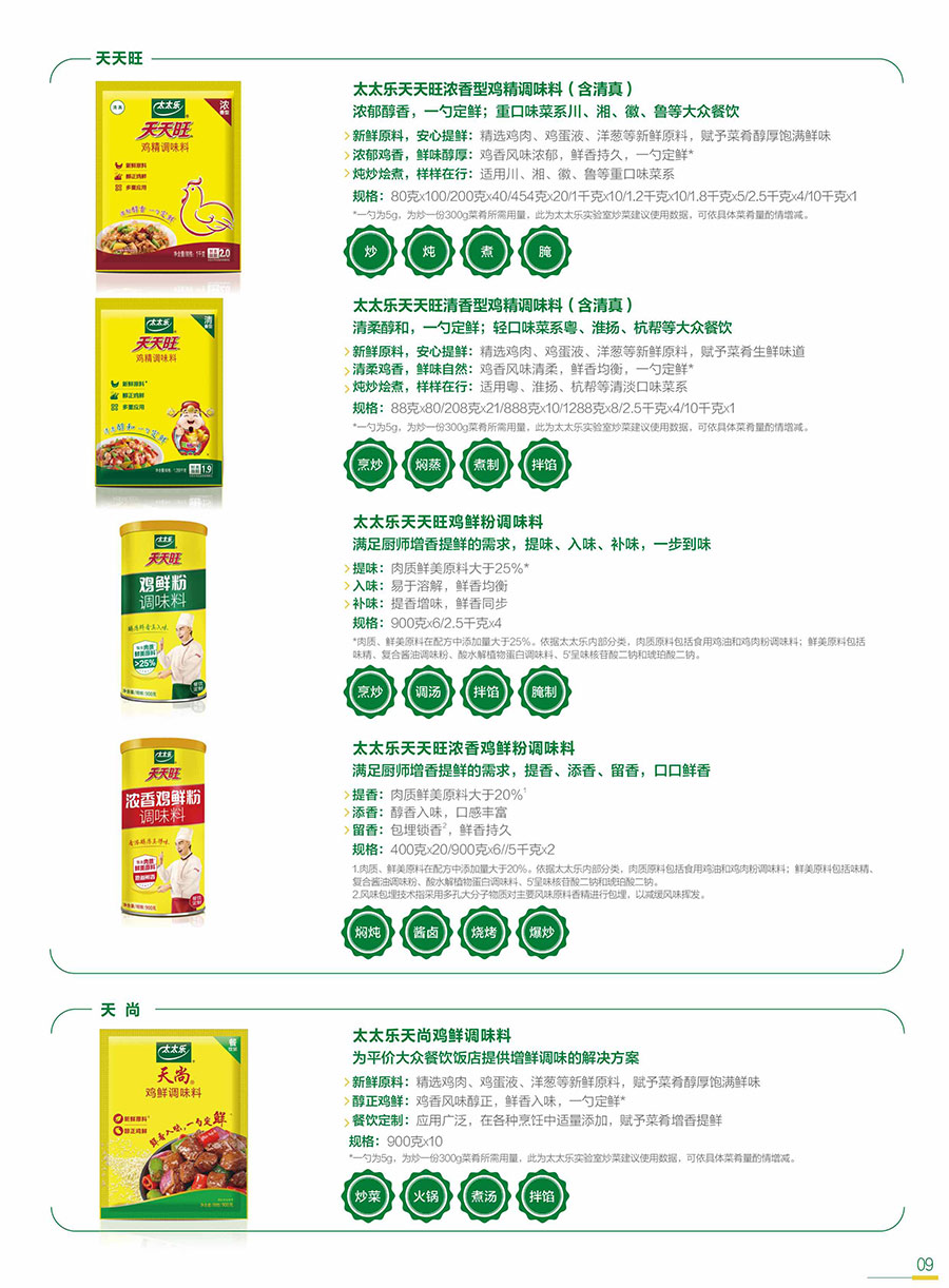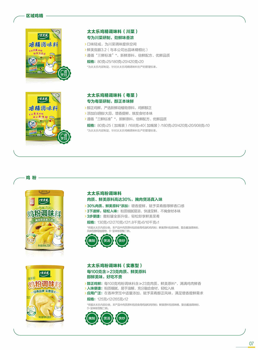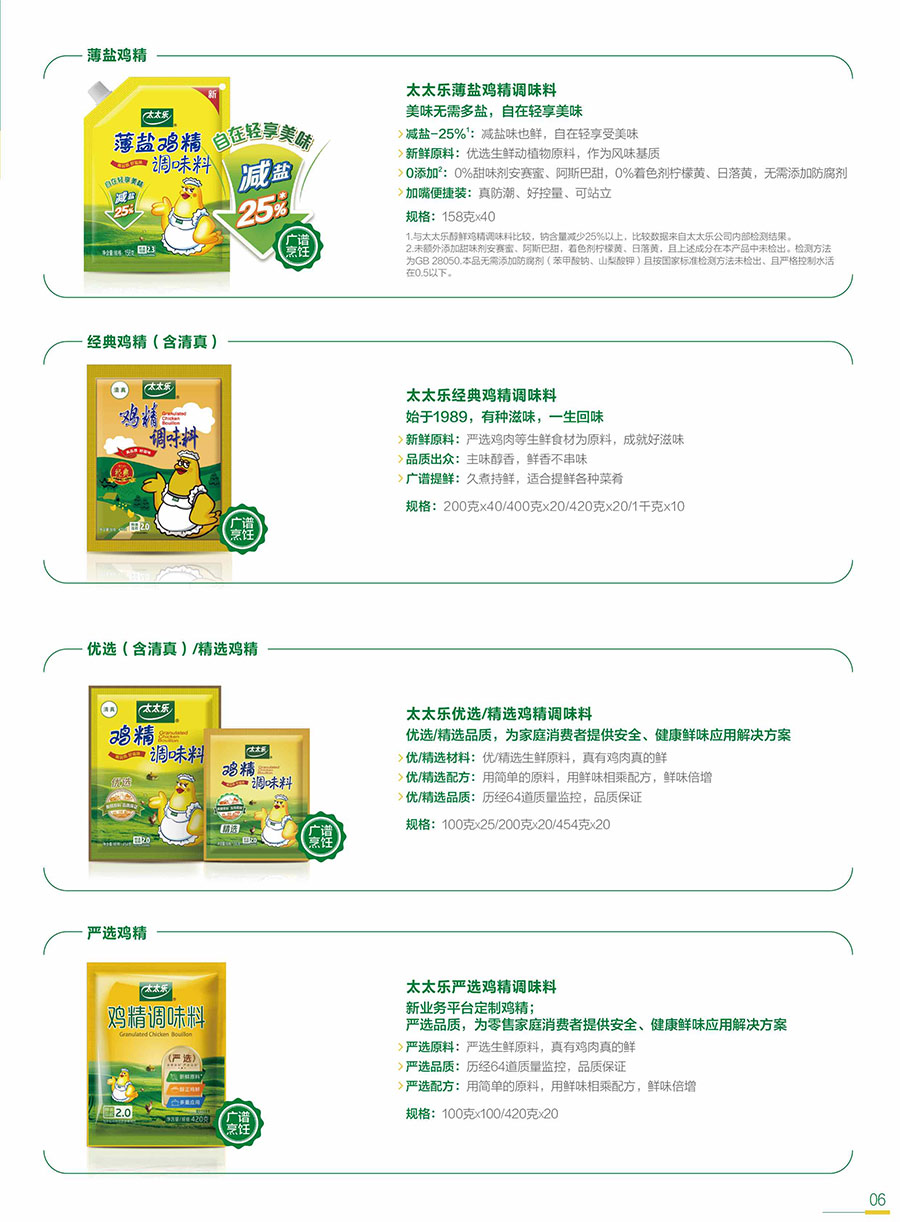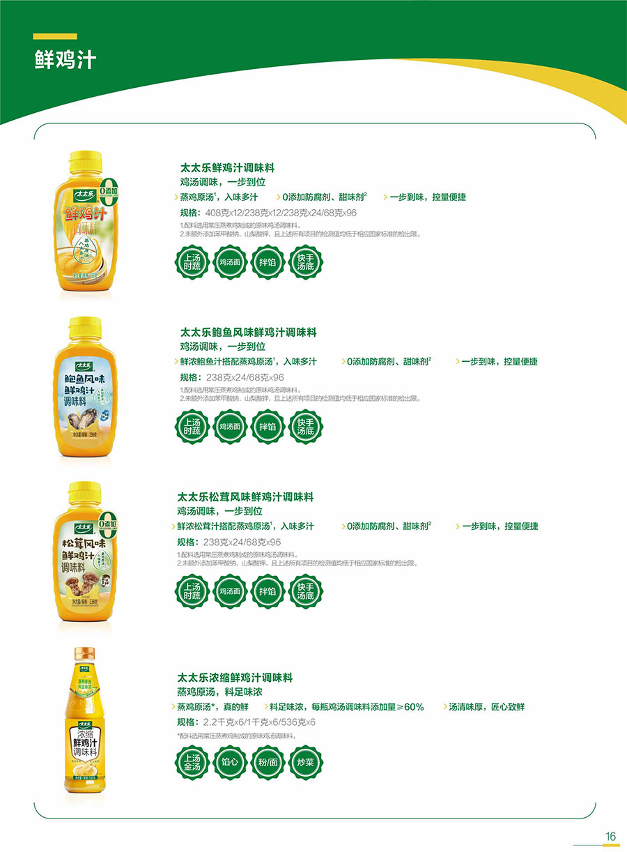 主要產(chǎn)品:三鮮雞精、原味鮮雞精調(diào)味料、原味鮮醬油系列、鮮雞汁、宴會醬蘸汁、天天旺等