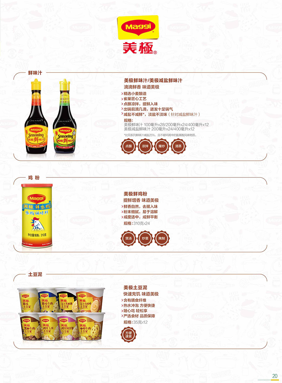 上海太太樂食品有限公司創(chuàng)立于1988年,于1999年加入雀巢,是中國雞精、雞粉行業(yè)標(biāo)準(zhǔn)起草單位之一。秉承“讓十四億人嘗到更鮮美滋味”的企業(yè)使命,太太樂始終致力于鮮味科學(xué)的研究和推廣,持續(xù)帶動鮮味行業(yè)的發(fā)展;產(chǎn)品覆蓋不同系列,多個子品牌,產(chǎn)品規(guī)格達500多個品項。
