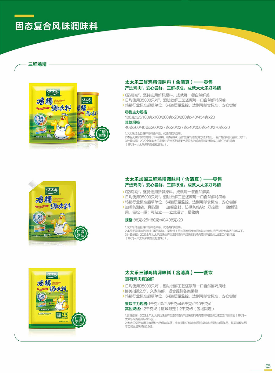 太太樂三鮮雞精調(diào)味料不斷獲得業(yè)內(nèi)廣泛贊譽,共筑調(diào)味品產(chǎn)品品質(zhì)與安全;太太樂原味鮮松茸調(diào)味料為消費者提供美味與健康兼顧的解決方案,全家人盡享美味又安心,實現(xiàn)從大自然到餐桌的安心鮮美。