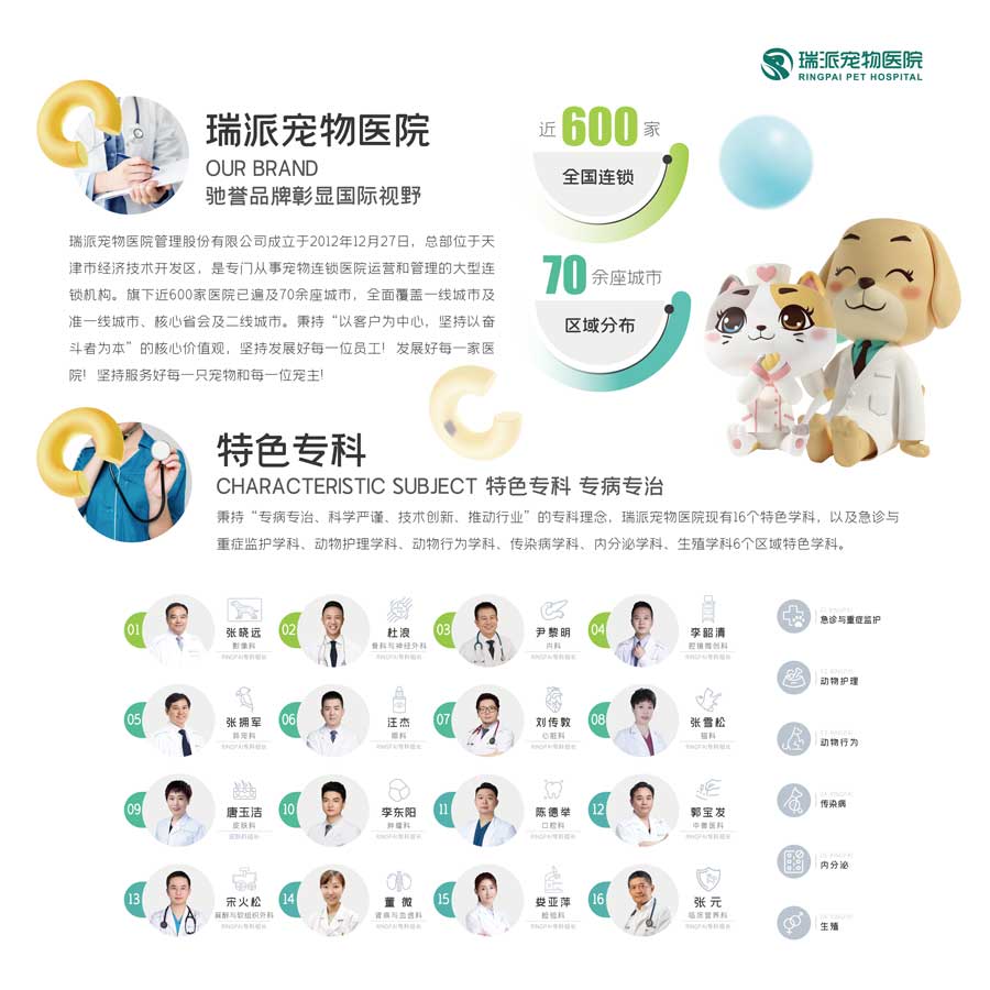 瑞派寵物醫院管理股份有限公司成立于2012年12月27日,總部位于天津經濟技術開發區,是專門從事寵物連鎖醫院運營和管理的大型連鎖機構。旗下近600家醫院已遍及70余座城市,全面覆蓋一線城市及準一線城市、核心省會及二線城市。秉持“專病專治、科學嚴謹、技術創新、推動行業”的專科理念,瑞派寵物醫院現有16個特色學科,以及急診與重癥監護學科、動物護理學科、動物行為學科、傳染病學科、內分泌學科、生殖學科6個區域特色學科。踐行“以客戶為中心,堅持以奮斗者為本”的核心價值觀,堅持發展好每一位員工!發展好每一家醫院!堅持服務好每一只寵物和每一位寵主!