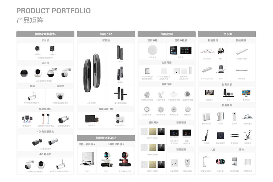 主要產品:螢石(EZVIZ)智能家居攝像機、智能入戶、智能服務機器人、智能控制、螢石物聯云平臺