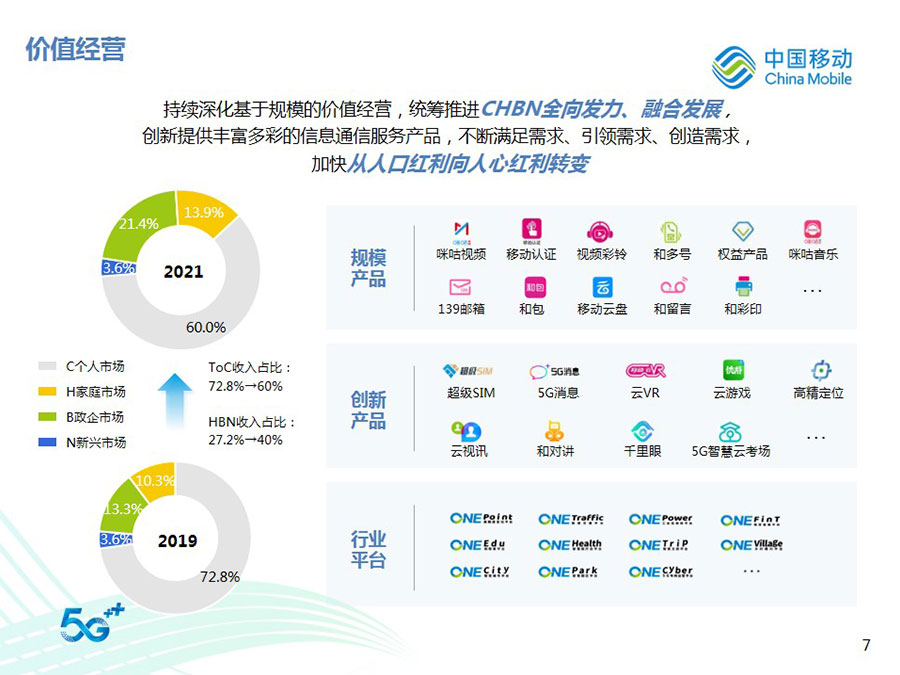 2022年,中國移動全年營運收入達到人民幣9,373億元,同比增長10.5%,其中通信服務收入達到人民幣8,121億元,同比增長8.1%。CHBN客戶規模、收入規模全面增長,HBN收入占通信服務收入比達到39.8%,同比提升4.1個百分點。得益于5G應用、移動云、數字內容、智慧家庭等業務的快速拓展,數字化轉型收入達到人民幣2,076億元,同比增長30.3%。整體來看,公司著力打造的數字化轉型收入增長“第二曲線”卓有成效,收入結構更加均衡穩健,可持續增長動能不斷增強,抗風險能力顯著提升。