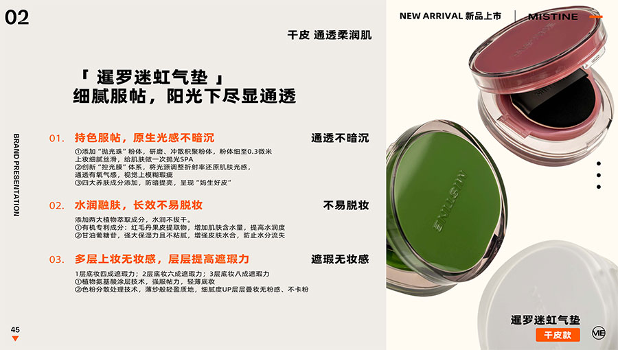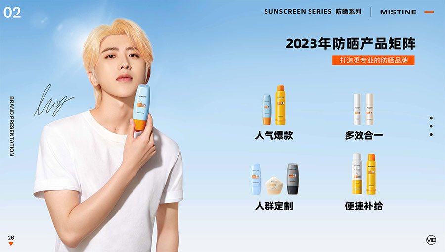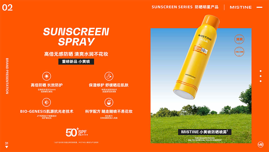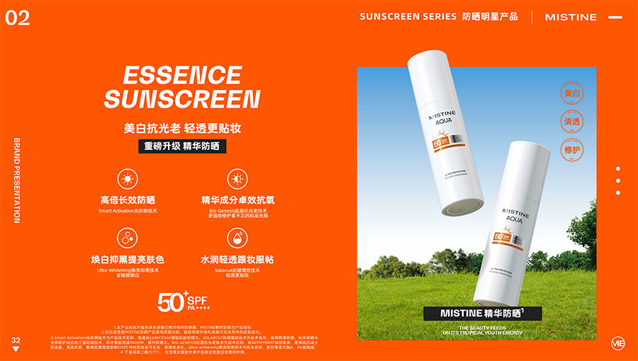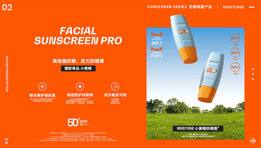 MISTINE蜜絲婷提出皮膚科學、前沿科技、靈魂成分、熱帶美學、卓越功效、保護環(huán)境六大品牌價值,致力于為全球女性提供豐富、安全、高品質(zhì)的美妝產(chǎn)品。基于MISTINE蜜絲婷品牌首席科學顧問——全球計算生物學權(quán)威之一、諾貝爾化學獎得主Arieh Warshel的研究,MISTINE蜜絲婷創(chuàng)新防曬品類推出「光生物學」防曬系統(tǒng),提出“外層防護、中層修護和底層抗損”防曬新理念,引領防曬從“表面防護”進入“深度抗光老”新時代。同時,MISTINE蜜絲婷還持續(xù)深耕專業(yè)彩妝市場,以熱帶美學基因造就產(chǎn)品防水防汗、高倍耐曬、長效持妝的優(yōu)勢,圍繞消費者需求打造多元化的產(chǎn)品矩陣,引領防曬、底妝賽道發(fā)展。