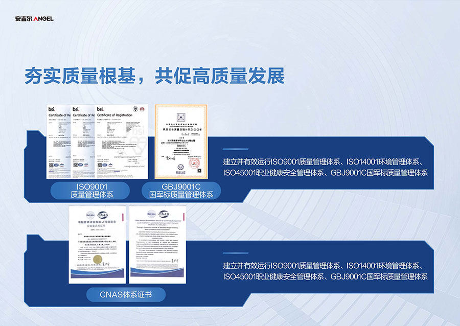 安吉爾擁有三大生產基地,其中安吉爾環境科技智慧園占地超60萬平方米,可實現年產1000萬臺(套)的凈飲水產品規模。安吉爾擁有完整的生產管理體系,已獲中國CQC、美國UL、美國NSF、加拿大CSA、法國BV、英國ITS、瑞士SGS和德國TüV全球八項權威機構認證。