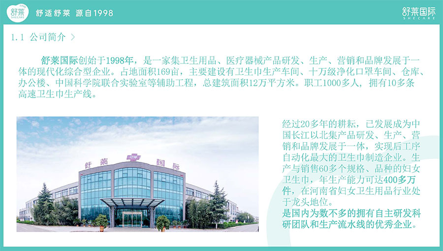 河南舒萊衛(wèi)生用品有限公司成立于1998年,位于許昌市襄城縣產業(yè)集聚區(qū),是一家集自主研發(fā)、生產、銷售及服務于一體的中原地區(qū)及周邊省份最大的婦女衛(wèi)生巾和婦女衛(wèi)生護墊的專業(yè)生產企業(yè)。
