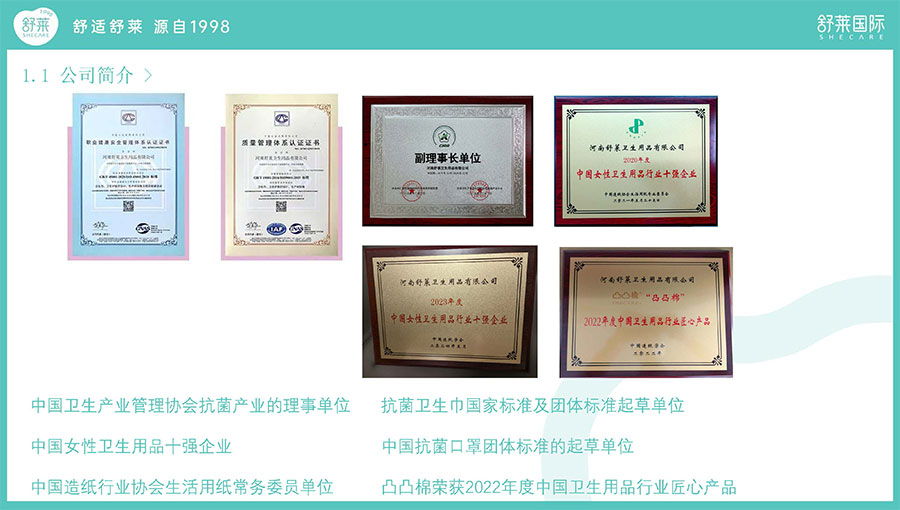 2022年,該公司“舒萊”、“凸凸棉”品牌被中國造紙學會評定為“2022年度中國衛(wèi)生用品行業(yè)匠心產品”;