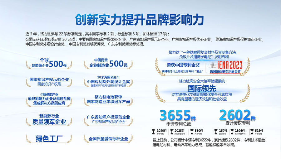 2022年,“一種鈦酸鋰復合材料及其制備方法、負極片及鋰離子電池”發明專利獲得中國專利金獎,摘得鋰電池行業內的發明專利“首金”;2023年,該專利技術再次斬獲第75屆德國紐倫堡發明國際金獎。“高安全大倍率儲能系統關鍵技術研發與應用”項目被中國機械工業聯合會鑒定達到“國際領先”水平。截止目前,公司先后獲得“中國民營企業制造業500強”、“全國質量信得過產品”、“客車安全技術成果獎”、“中國儲能產業最具影響力企業獎、最佳系統集成商、最佳儲能電池供應商”等榮譽,獲得工信部頒發的“綠色工廠”榮譽稱號;上榜科技部發布的新能源領域獨角獸企業,多年入選全球新能源企業500強,入選“全國百佳質量檢驗誠信標桿企業”、“國家知識產權優勢企業”等。