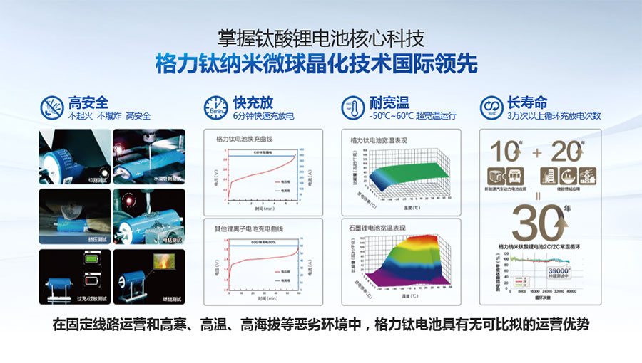 鈦酸鋰電池技術是新能源行業唯一獲得中國專利獎金獎的鋰電池產品技術,其應用于儲能電池和動力電池具有超高安全性,在快充放、耐寬溫、長壽命等方面同樣具有卓越的性能。格力鈦電池系列產品具有不起火不爆炸高安全、6分鐘快充放、-50℃至60℃耐寬溫特性,循環充放電次數高達30000多次,使用壽命長達30年。格力鈦電池經利鋸切割、尖針穿刺、強力擠壓、電鉆沖孔、短路充放電、高溫加熱、槍擊等極限條件測試,均未發生冒煙、起火、燃燒、爆炸等現象。