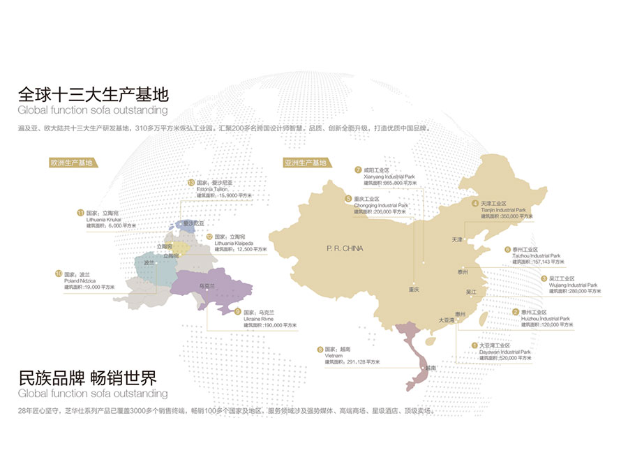 在全球設(shè)有多家子公司、分公司及關(guān)聯(lián)公司,運(yùn)營(yíng)網(wǎng)絡(luò)橫跨亞、美、歐、澳四大洲,擁有超過(guò)8000個(gè)銷(xiāo)售終端,產(chǎn)品暢銷(xiāo)中國(guó)、美國(guó)、英國(guó)、加拿大等100多個(gè)國(guó)家及地區(qū),旗下“CHEERS”、“芝華仕”和“頭等艙”品牌專賣(mài)店超過(guò)8000家,形成了體系完備的全球跨國(guó)發(fā)展大格局,已成為集研發(fā)、制造、銷(xiāo)售和服務(wù)于一體的國(guó)際化智能家居企業(yè)。
