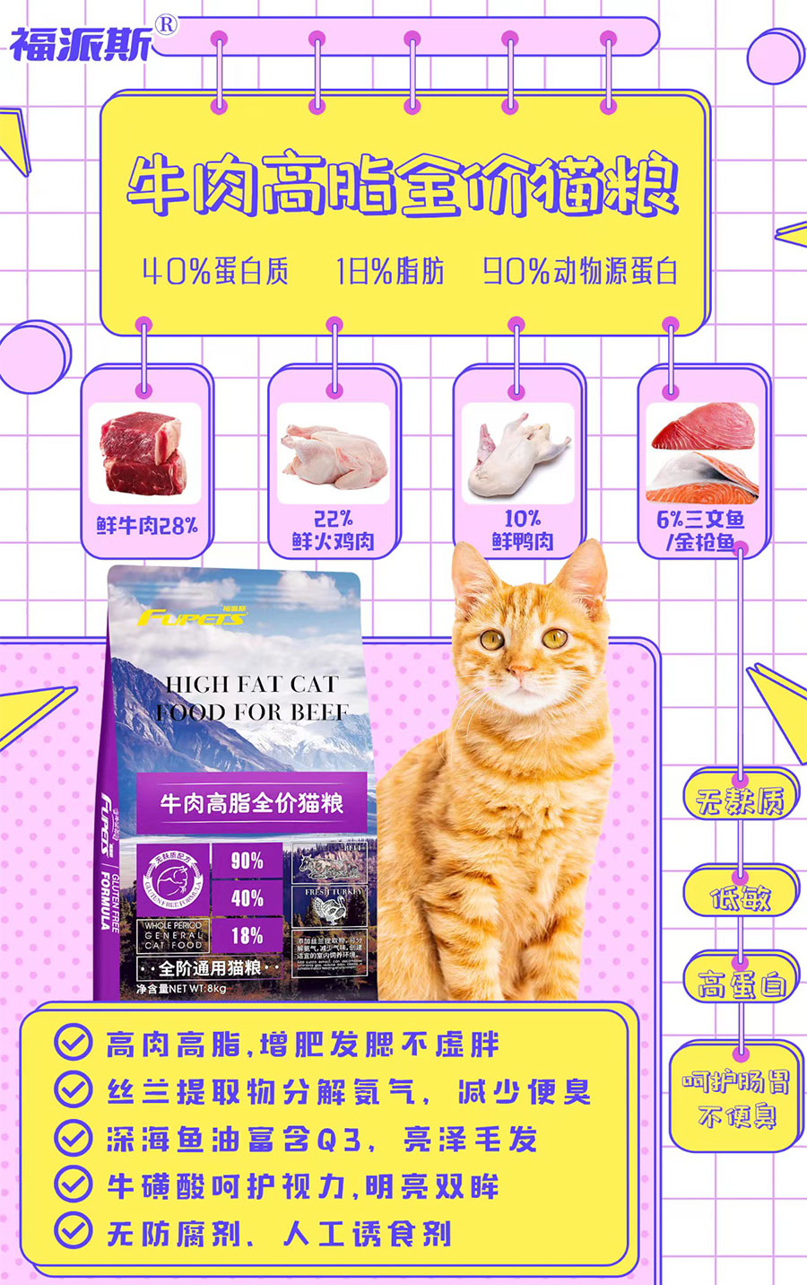 主要產(chǎn)品:福派斯FUPETS鮮肉無谷犬貓糧、無麩質(zhì)低敏貓糧和犬貓罐頭、零食