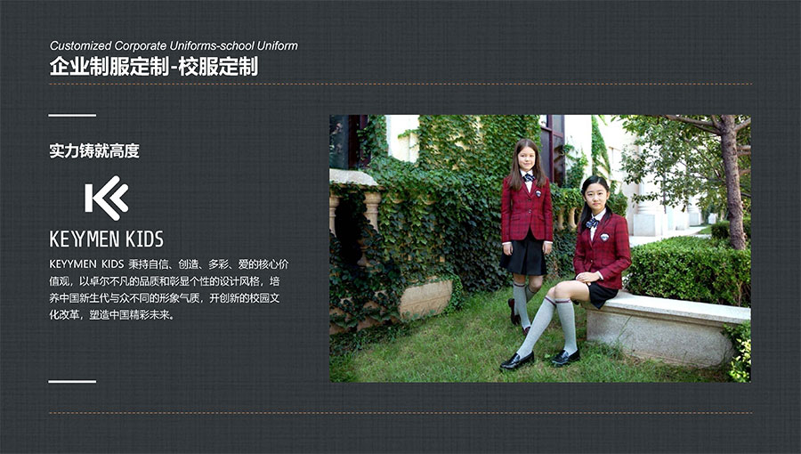 凱門學(xué)生裝(KEYYMEN KIDS)秉持自信、創(chuàng)造、多彩、愛的核心價(jià)值觀,堅(jiān)持“領(lǐng)先一步,步步領(lǐng)先”的品牌理念,致力于打造最具影響力的學(xué)生裝品牌,為中國青少年形象代言,以卓爾不凡的品質(zhì)和彰顯個(gè)性的設(shè)計(jì)風(fēng)格,培養(yǎng)中國青少年與眾不同的形象氣質(zhì)。