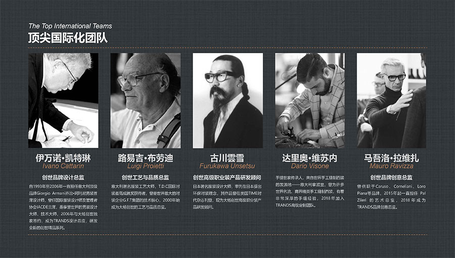 創(chuàng)世品牌(TRANDS):創(chuàng)建于1995年,是當(dāng)今中國高級男裝的代表品牌之一。TRANDS創(chuàng)世成衣產(chǎn)品及量身定制的西裝以其至臻品質(zhì)和精湛工藝,贏得眾多國際政商精英多年來的青睞。