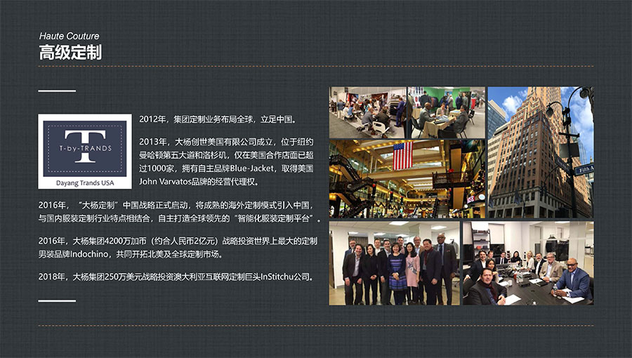 目前,大楊集團(tuán)全球營銷網(wǎng)絡(luò)已遍布美國、加拿大、荷蘭、英國、澳大利亞及日本等27個(gè)國家和地區(qū),開設(shè)單裁合作店面上千家,與加拿大互聯(lián)網(wǎng)定制巨頭Indochino公司、澳大利亞知名男裝定制企業(yè)Institchu公司、美國服裝巨頭TBI公司簽署戰(zhàn)略合作協(xié)議,年定制產(chǎn)品數(shù)量已突破200萬件/套,具備西裝、襯衫、休閑裝以及大衣、風(fēng)衣等全品類定制生產(chǎn)能力。