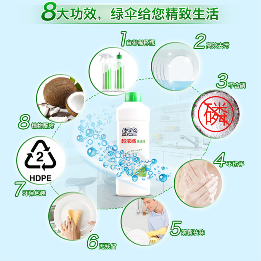 主要產品:綠傘、綠蕊、小閑牌洗衣液系列、油煙凈系列、洗潔精系列;廁潔系列;玻璃地板清潔系列;洗手液系列;消毒液系列、智能刷系列等