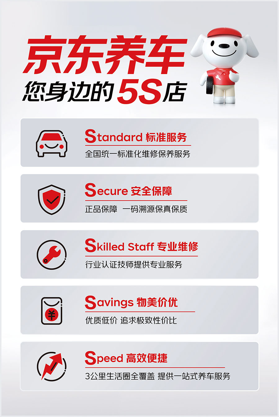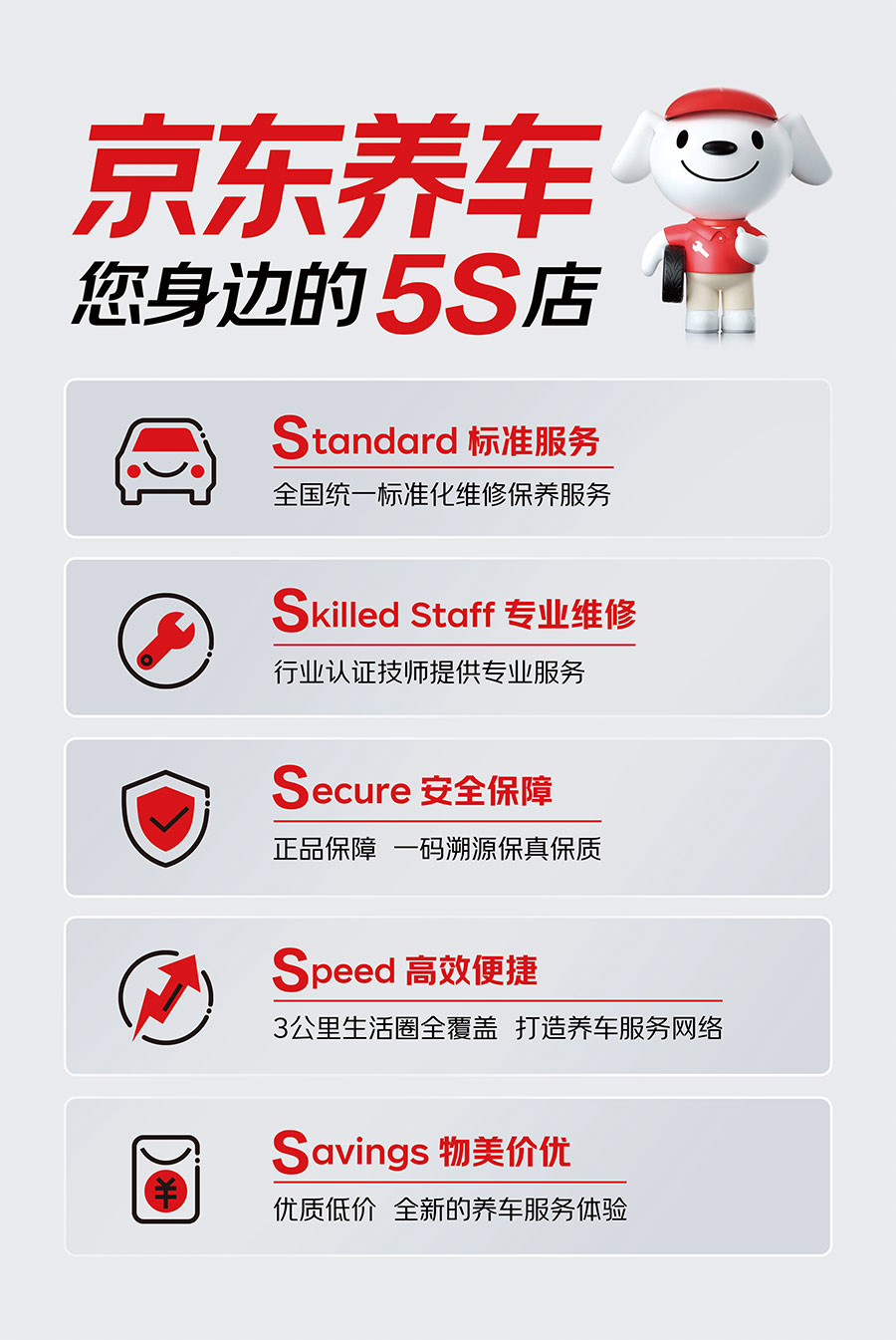 在養車標準方面京東養車秉承有保障、更專業的品牌服務理念,推出全新5S服務標準。從多個維度保障客戶權益,提升服務品質。