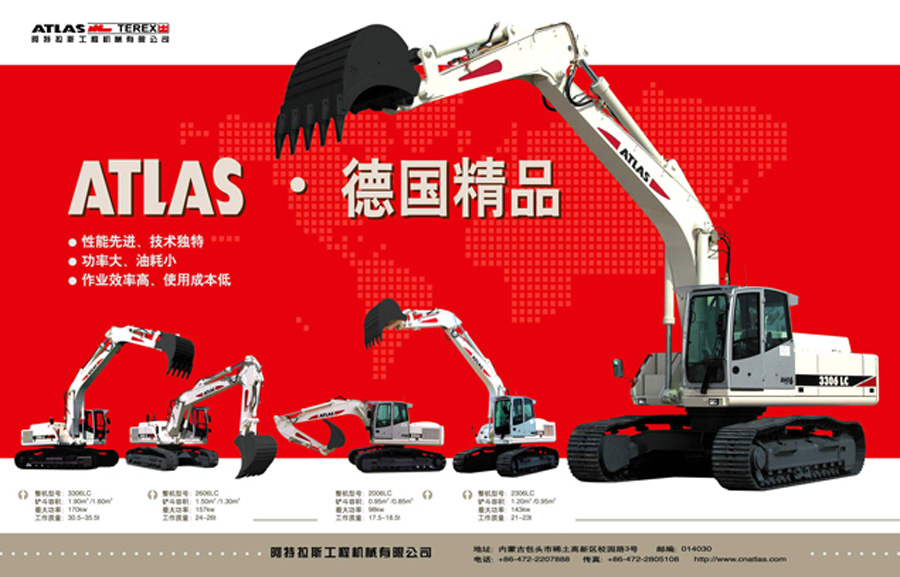 中國阿特拉斯是高新技術企業,主要生產和銷售具有世界先進水平的ATLAS 20噸級以上中大型及礦用挖掘機。該系列挖掘機具有“性能先進、技術獨特;功率大、油耗小;作業效率高、使用成本低”的突出特點,可廣泛應用于礦山開采及城鄉建設。