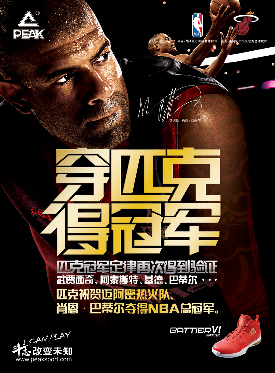 品牌國際化:2005年,匹克全面加速“品牌國際化”戰略,先后通過贊助歐洲籃球全明星賽、斯坦科維奇杯洲際籃球賽等國際一流賽事,攜手休斯頓火箭隊、邁阿密熱火隊等頂級NBA球隊,結盟NBA、FIBA、WTA等頂級國際賽事組織,簽約巴蒂爾、基德等20多位NBA頂級球星以及格沃特索娃等9位網球明星,支持伊拉克、新西蘭等10多個國家隊和國家奧委會,一舉成為中國體育品牌中,國際資源最豐富的國際化運動品牌。