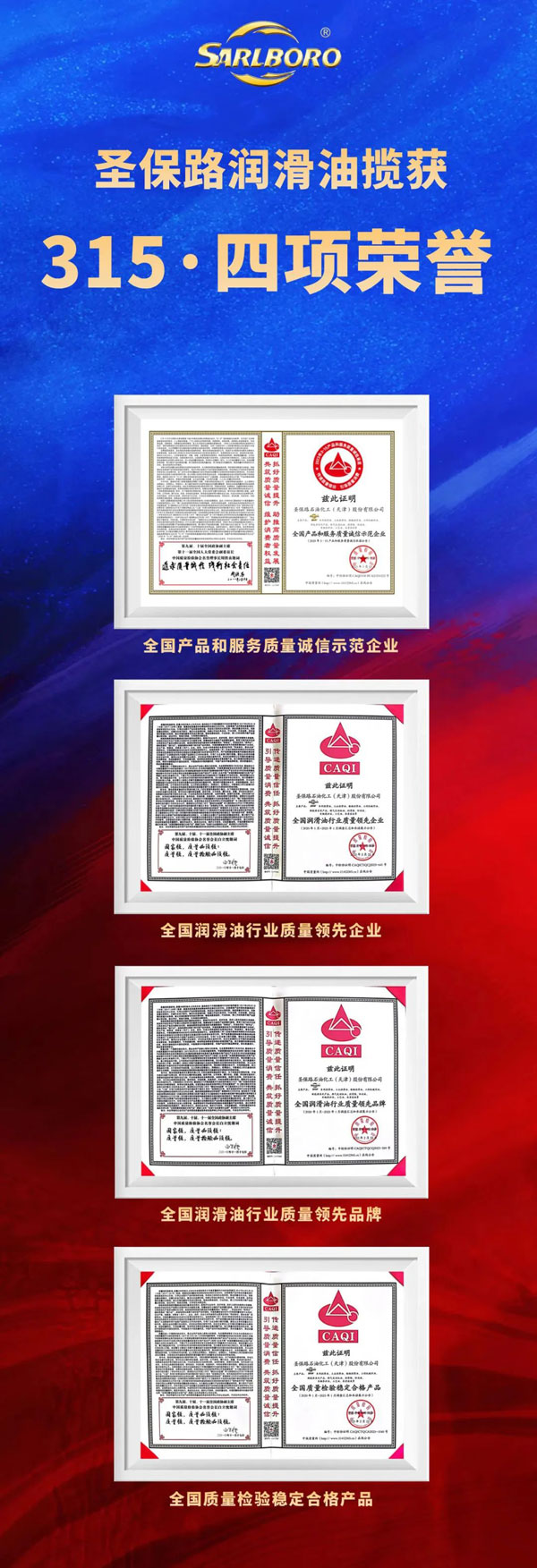 在“3·15”國際消費者權益日到來之際,圣保路再度榮獲中國質量檢驗協會頒發的2023年“全國產品和服務質量誠信示范企業”、“全國潤滑油行業質量領先企業”、“全國潤滑油行業質量領先品牌”、“全國質量檢驗穩定合格產品”四項榮譽稱號。