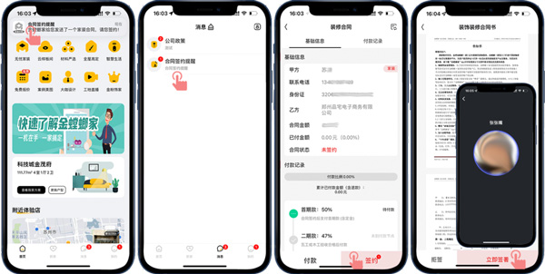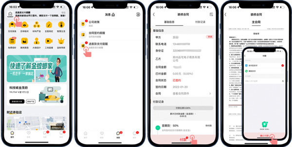 客戶線上確定好裝修門店后,門店會擬好線上合同,并推送到客戶的APP賬號,客戶收到合同簽約提醒就可以在線簽約操作了,合同簽好后通過進(jìn)度款支付提醒可以進(jìn)行在線付款操作。