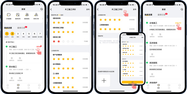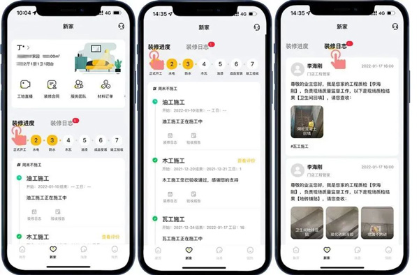 通過“新家-裝修進(jìn)度”和“新家-裝修日志”模式,直觀地了解到目前的裝修階段,工程隊(duì)每日的工作內(nèi)容,讓客戶在家就能了解施工進(jìn)度、感受工程品質(zhì)!