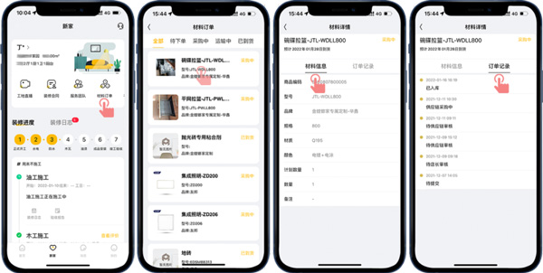 此外,也能在“新家-材料訂單”查看裝修涉及到的材料采購和到貨情況,省去客戶去現(xiàn)場查看的麻煩,如果材料未按約定時間到貨,客戶也能及時跟催門店處理,以免耽誤裝修進(jìn)度。