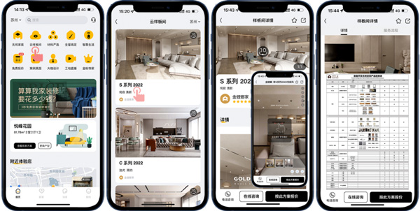 客戶想看整裝樣板間?不一定要去線下展館,一部手機(jī)就能逛夠癮。在金螳螂家APP“云樣板間”里,就可720云VR觀看各個空間的效果,里面可查看超詳細(xì)的空間材料配置表,都是優(yōu)質(zhì)大牌產(chǎn)品,還能隨時隨地針對產(chǎn)品進(jìn)行在線咨詢,并按照戶型預(yù)估樣板間設(shè)計(jì)報價。