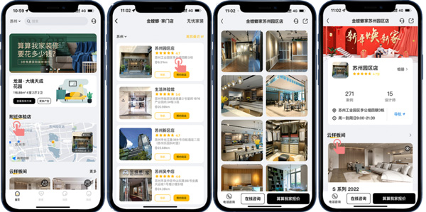 目前,金螳螂家在全國擁有150家門店,客戶可以通過“附近體驗(yàn)店”選擇客戶所在城市的服務(wù)門店,在這里可以了解到該門店的720度VR全景樣板間、案例、設(shè)計(jì)師以及客戶的真實(shí)評價,不用出門探訪實(shí)體門店,就能快速了解門店情況,省時又省力!