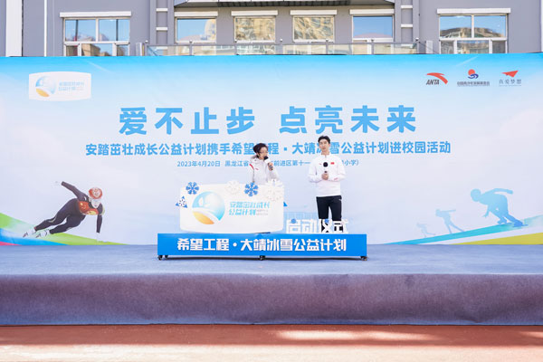 2023年4月20日,安踏茁壯成長公益計劃攜手希望工程·大靖冰雪公益計劃進校園啟動儀式,在黑龍江省佳木斯市前進區(qū)第十一小學(下簡稱十一小學)舉行。通過體教融合,深耕青少年體育公益,發(fā)展冰雪運動,為青少年茁壯成長賦能。安踏集團為十一小學全體師生捐贈了安踏裝備包,捐建了武大靖-安踏夢想中心,體育教師接受了安踏體育課教師培訓。短道速滑奧運冠軍武大靖重返兒時母校,分享冠軍故事,首次推出大靖冰雪課。安踏集團執(zhí)行董事、聯(lián)席CEO吳永華,安踏集團副總裁李玲,共青團黑龍江省委書記徐長勇,黑龍江省佳木斯市委副書記、代市長王鐵,上海真愛夢想公益基金會理事長潘江雪,共同出席活動,央視頻進行了全程直播。
