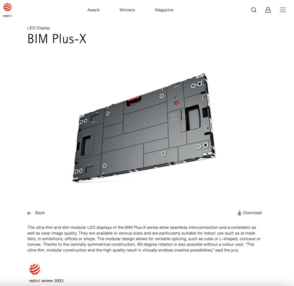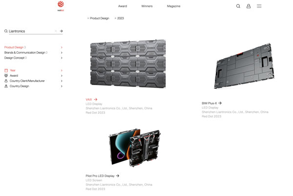 近日,2023年德國紅點設計大獎名單公布。聯建光電VAIII系列微間距顯示屏、Pilot Pro系列租賃顯示屏、BIM Plus-X系列室內商業顯示屏三款產品同時斬獲素有設計界“奧斯卡”之稱的紅點設計獎,這三款產品凝聚著全球前沿技術和創新設計,實至名歸。據統計,聯建光電是2023紅點獎中獲獎最多的LED顯示品牌。