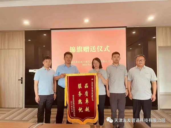 2023年6月,南京清泉城市建設工程股份有限公司送予天津友發管道科技有限公司“品質卓越 服務熱忱”的錦旗,對我公司產品質量及售后服務表示認可和感謝。