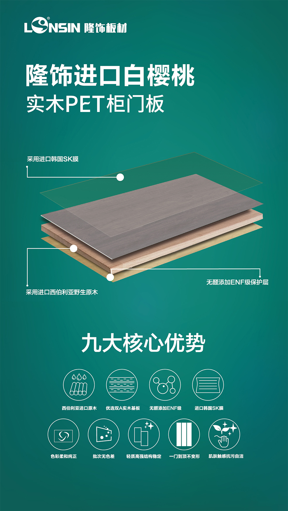 “提升高品質服務、推動綠色家居產業發展”是隆飾板材一直以來的發展使命,多年來,隆飾從未停止研發創新的步伐,不斷與時俱進,將“工匠精神”融入每一個環節中,打造更具競爭力的優勢產品和服務。不僅有一直引以為傲的ENF級生態板和市場大熱的家具板,隆飾還將重磅推出全新高端產品——“ENF級進口白櫻桃高端實木精板”,滿足了消費者對環保和品質愈發強烈的追求。