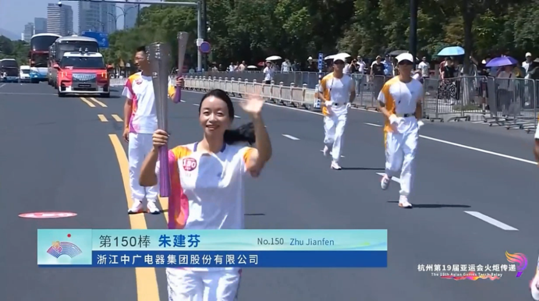 近日,杭州亞運會火炬傳遞正式啟動。浙江中廣電器集團股份有限公司黨委書記、副總裁朱建芬,作為杭州亞運會第150棒火炬手,參加溫州站的接力傳跑。