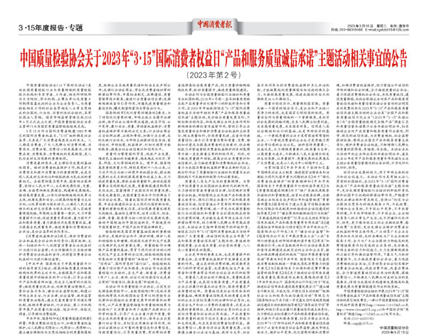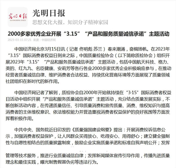 ——中國質量檢驗協會組織2000多家優秀典范企業開展“3.15”產品和服務質量誠信承諾活動