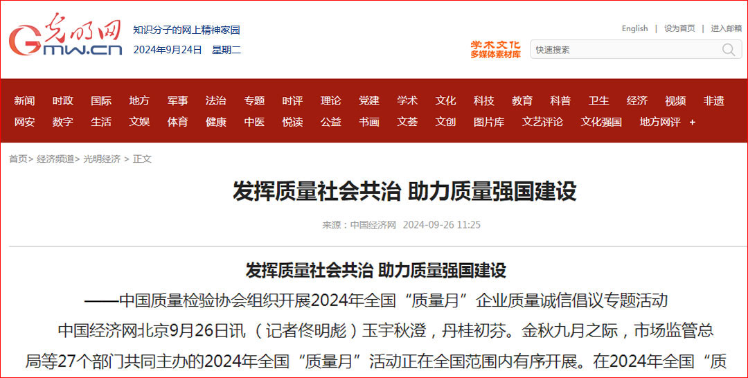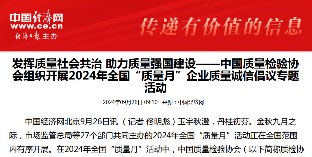 - 中國經濟網—發揮質量社會共治 助力質量強國建設——中國質量檢驗協會組織開展2024年全國“質量月”企業質量誠信倡議專題活動