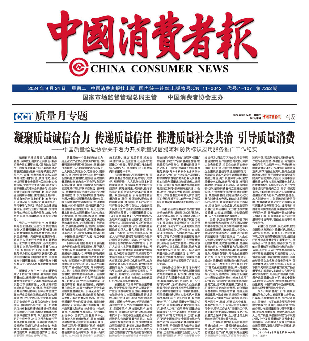 - 中國消費者報—凝聚質量誠信合力 傳遞質量信任 推進質量社會共治 引導質量消費——中國質量檢驗協會關于著力開展質量誠信溯源和防偽標識應用服務推廣工作紀實